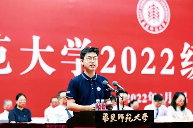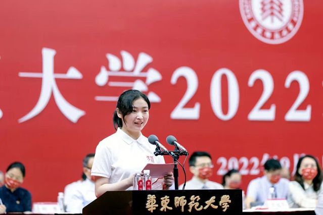 Wang Xinyu, an undergraduate student of Class 2022 of the Department of Chinese Language and Literature of ECNU, delivered a speech as a freshman representative. In her speech, she recounted the story of her encounter with paleography and ECNU, as well as her emotional journey when she was moved by ECNU’s concerns for her well-being upon receipt of the Letter of Admission and the great-value enrollment package. She wished that her classmates should be knowledgeable and wise, constantly improve themselves, have greater ambitions, work hard, and often think about how to apply what they’ve learned to what they do. She also called on everyone to stick to their ideals and passion and lead the development of the nation and society.