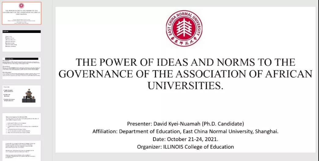 During October 21-24, the University of Illinois at Urbana-Champaign successfully held the annual Global Education Symposium online. The Symposium is a four-day event with opportunities to engage with scholars from around the world, undertake professional development activities, participate in informal networking activities, and more! Nine master and doctoral students from the ECNU Department of Education attended the Symposium (including 4 international students majoring in education policy and school reform). Now, let’s hear their feelings about the meeting.