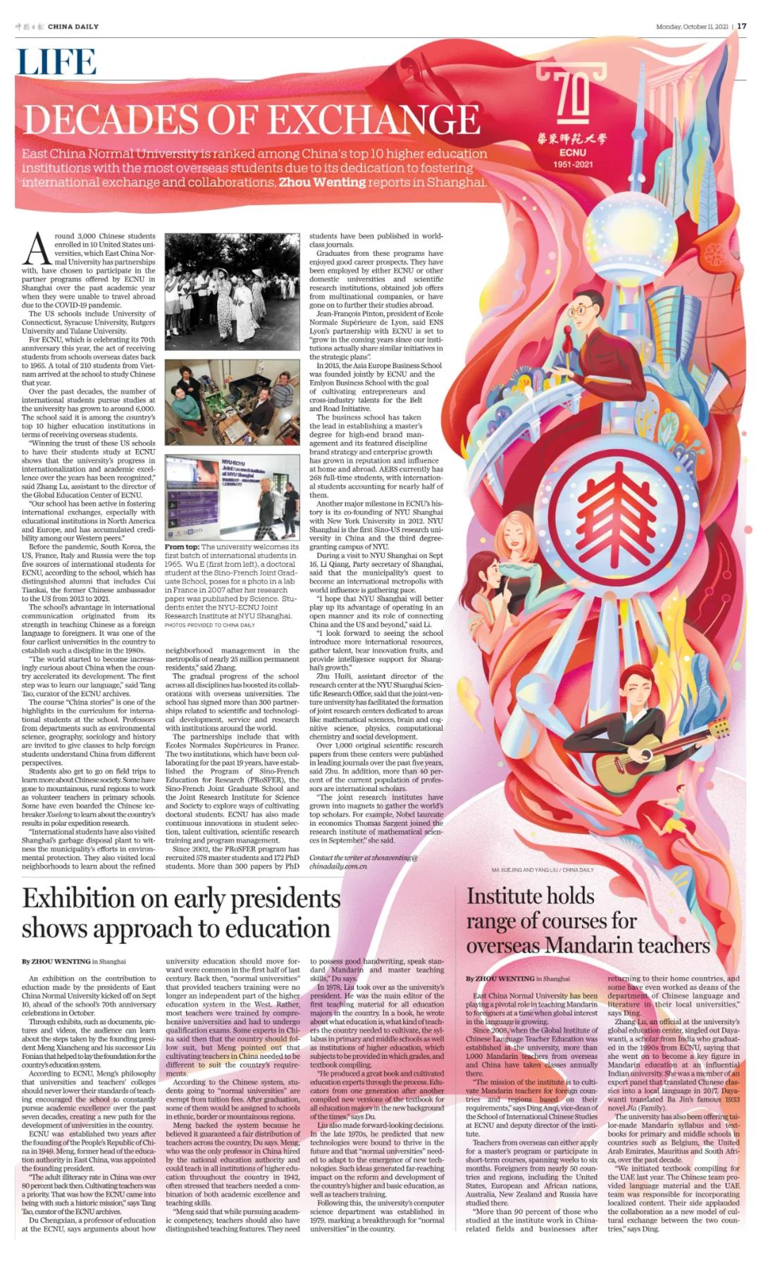 As ECNU celebrates its 70th birthday, China Daily, on October 11th featured ECNU under the theme 'Decades of Exchange' (Life, p.17). The decades of achievement were described by Shanghai reporter Zhou Wenting.