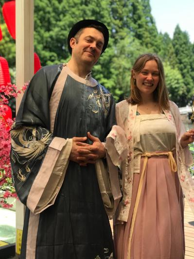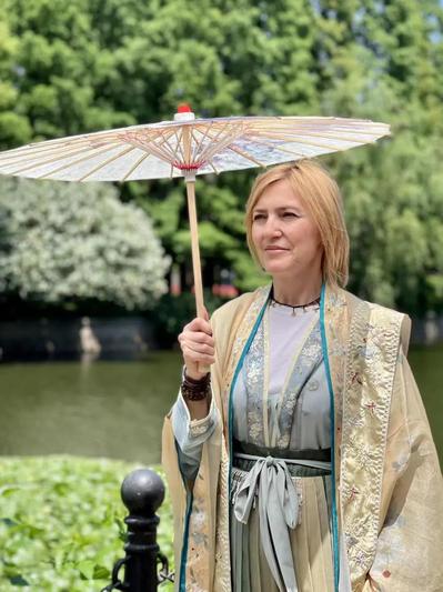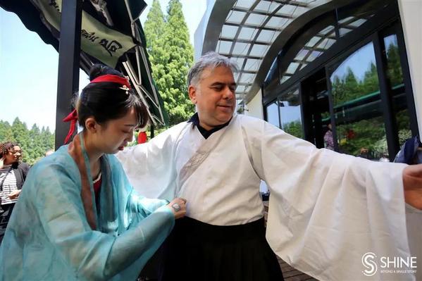 Huseyin Emre Engin, consul general of Turkey in Shanghai, tries on a classic hanfu.
