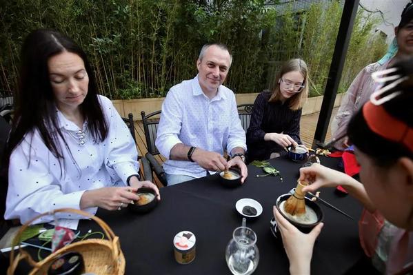 Andrei Andreyev, consul general of Belarus in Shanghai, and his family learn the art of making tea in the Song Dynasty.