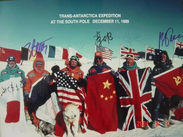 On December 11, 1989, the team successfully arrived at the South Pole. The team members from the six countries took group photos at the South Pole with their national flags.