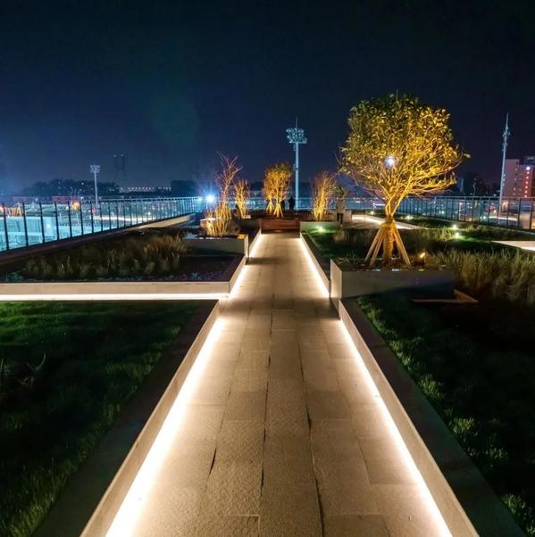 In the evening, the garden with its stone walkways is illuminated by lamps, presenting a more stunning view.