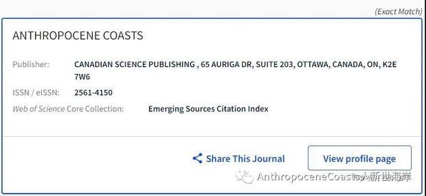On April 17, 2020, the editorial office for Anthropocene Coasts received notification from the Web of Science (WOS) that it had passed the strict review and reached the standard of entering ESCI (the Emerging Sources Citation Index). In July 2020, AnthropoceneCoasts was officially indexed by ESCI at the official website of the Web of Science Core Collection.