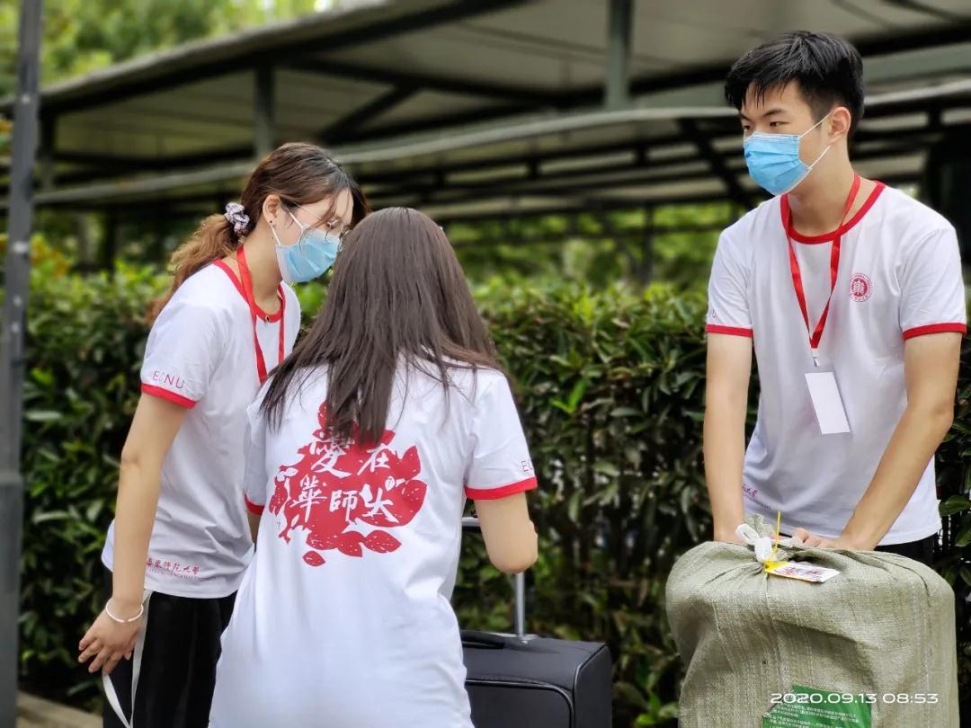 Student volunteers set off early in the morning to meet new ECNUers at Shanghai’s major railway stations and airports. On the campuses, volunteers helped freshmen carry their luggage, find their departments, show them around the campus, etc.