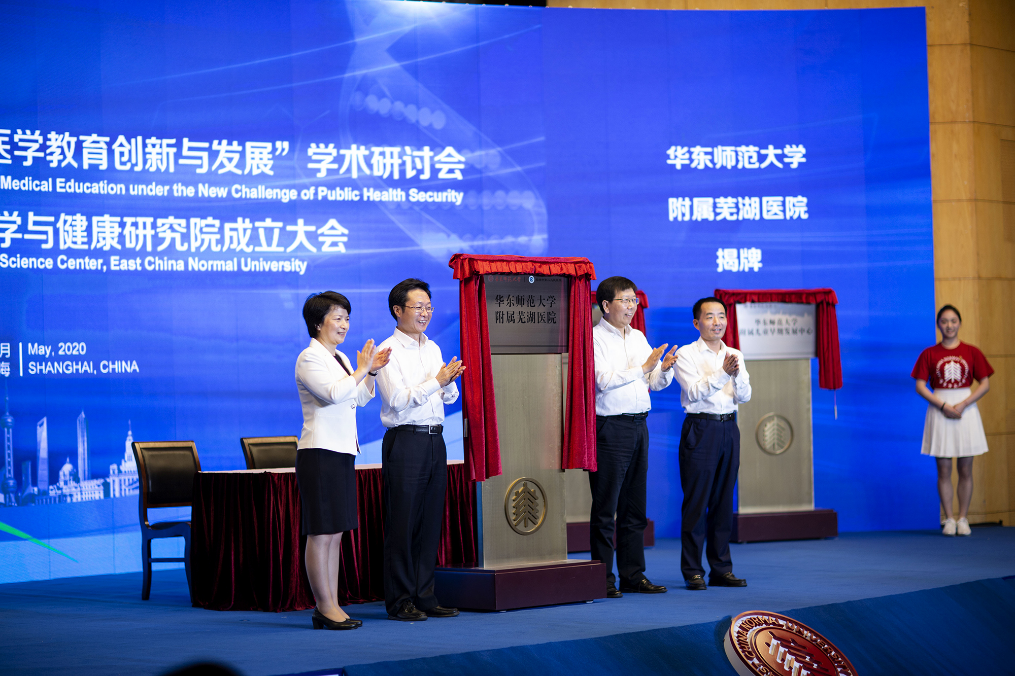 The plaque to mark the opening of the ECNU-affiliated Wuhu Hospital is unveiled at the meeting.