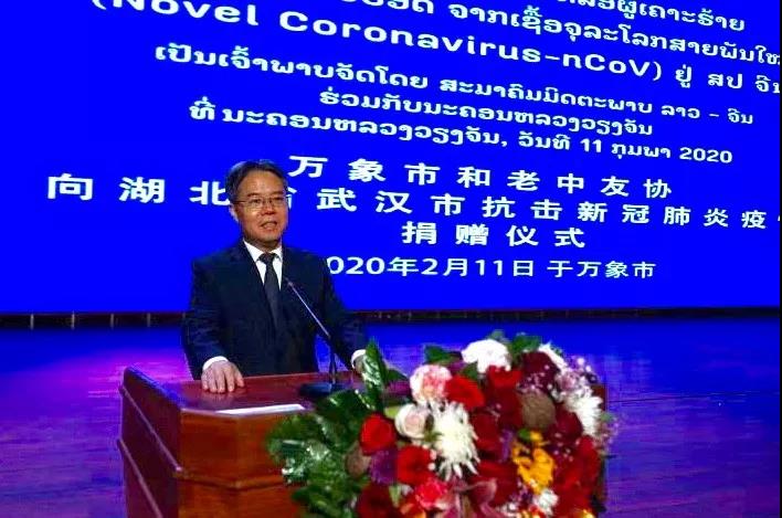 Chinese ambassador to Laos Jiang Zaidong makes a speech at the donation ceremony.