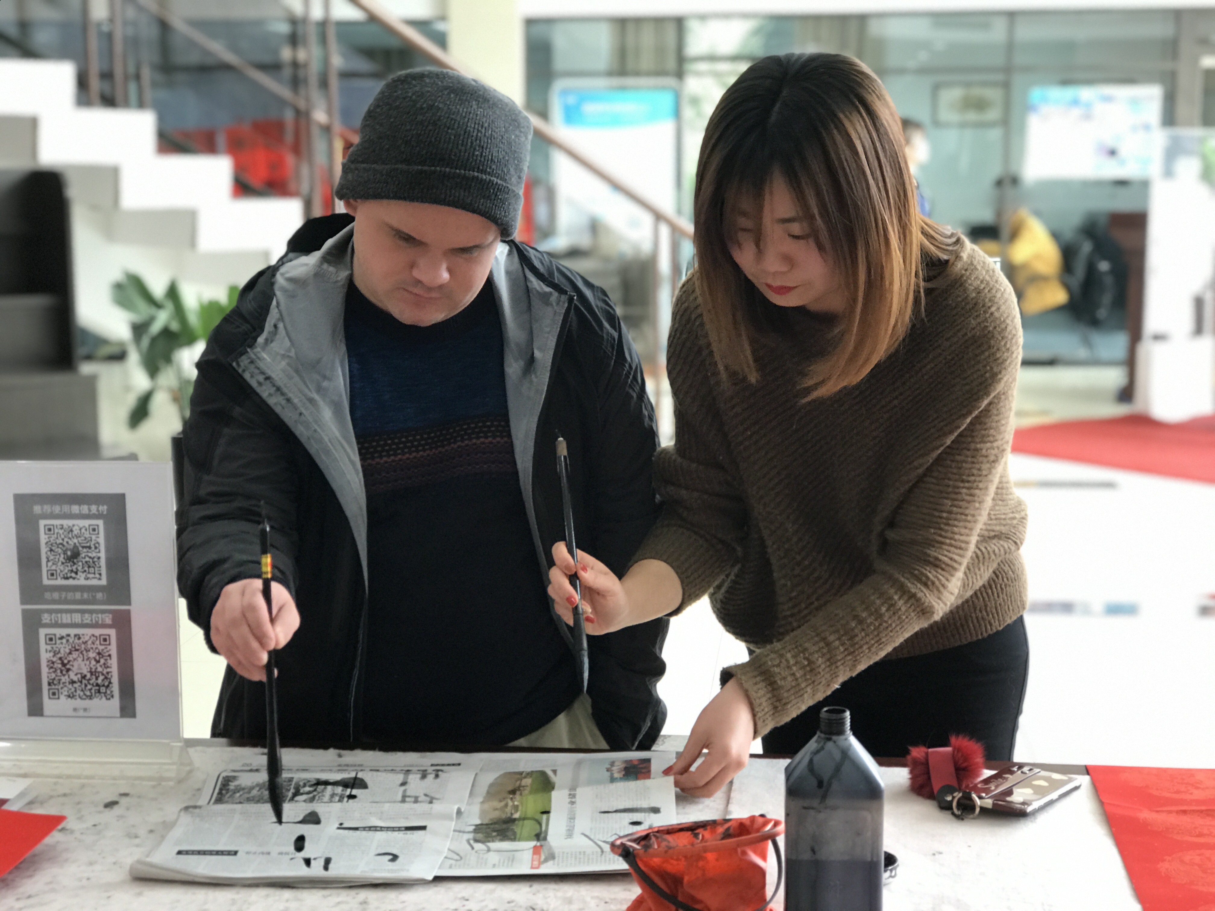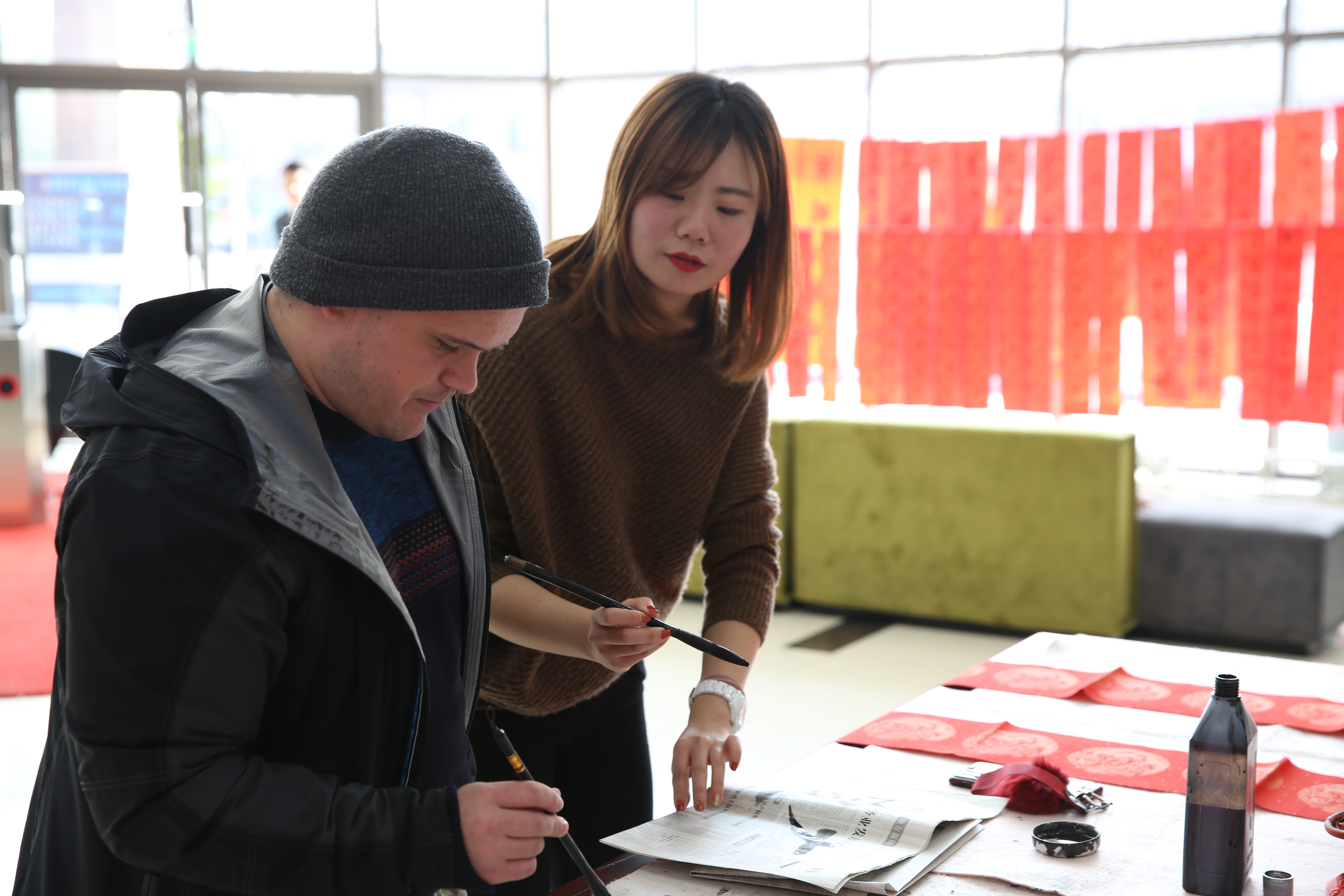 Among the visitors were some foreign friends, who got a chance to experience the Chinese traditional Spring Festival culture by trying their hands on writing Chinese calligraphy.