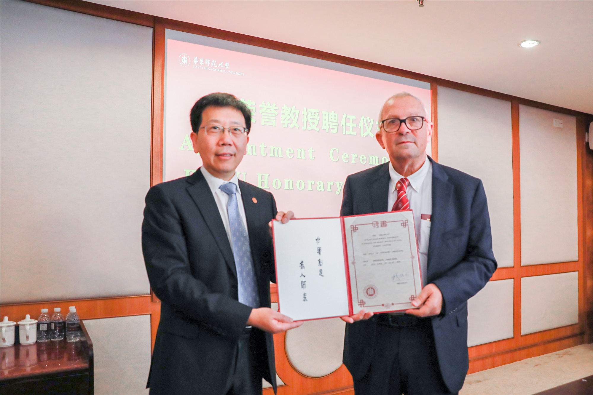 Joseph Sifakis receives certificates of appointment from ECNU president Qian Xuhong.