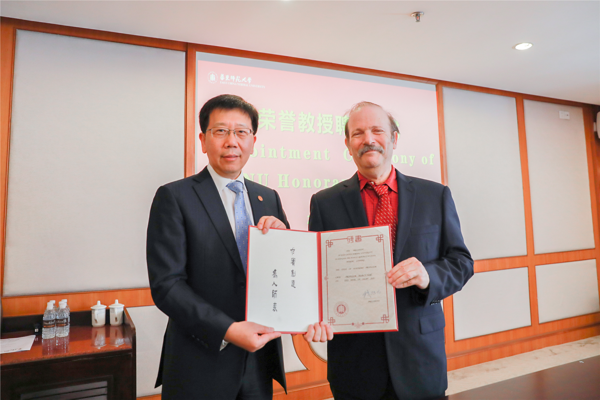 Moshe Y. Vardi receives certificates of appointment from ECNU president Qian Xuhong.