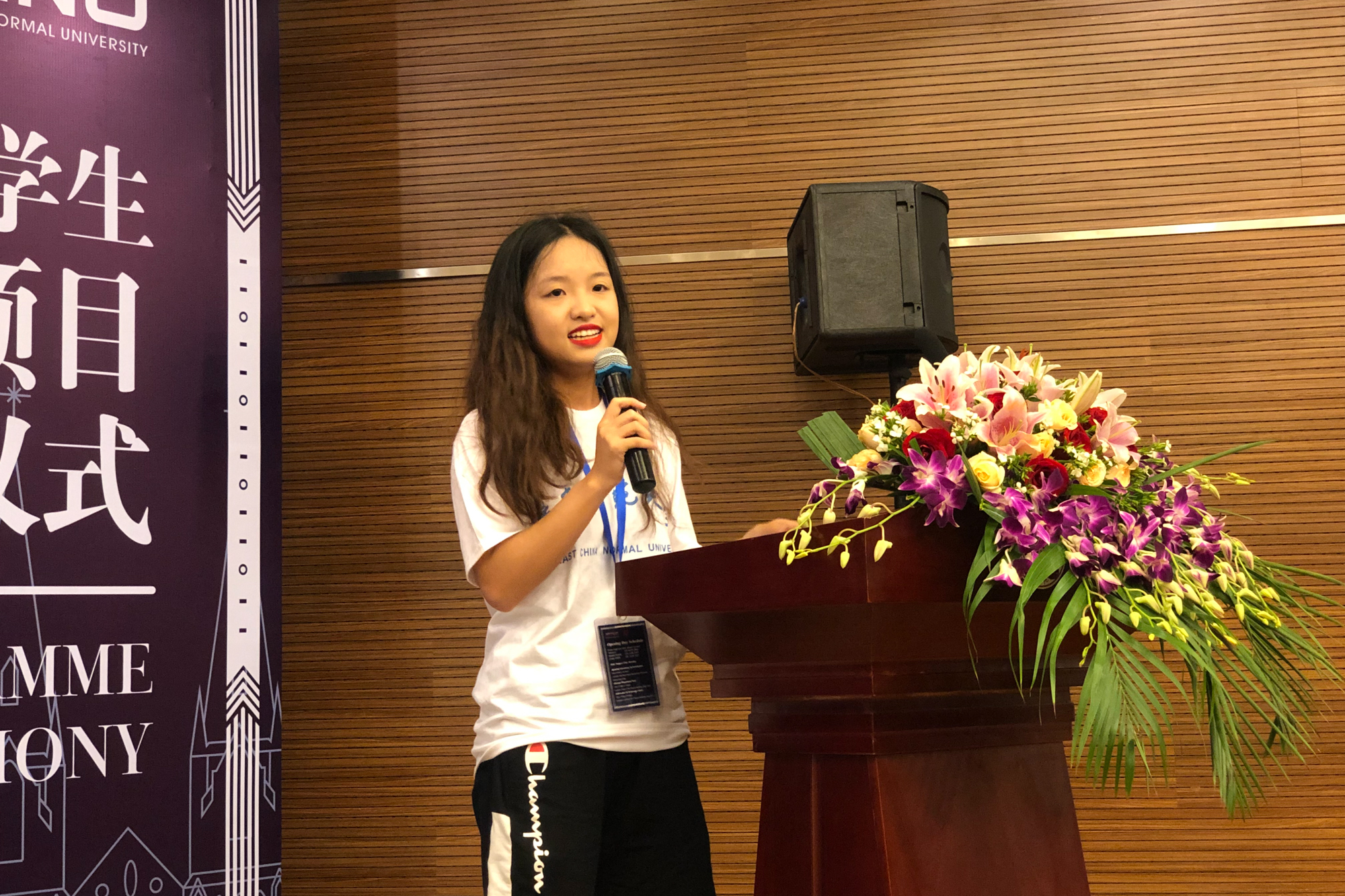 Guo Chenyu, an undergraduate of ECNU gives a speech as volunteer representative