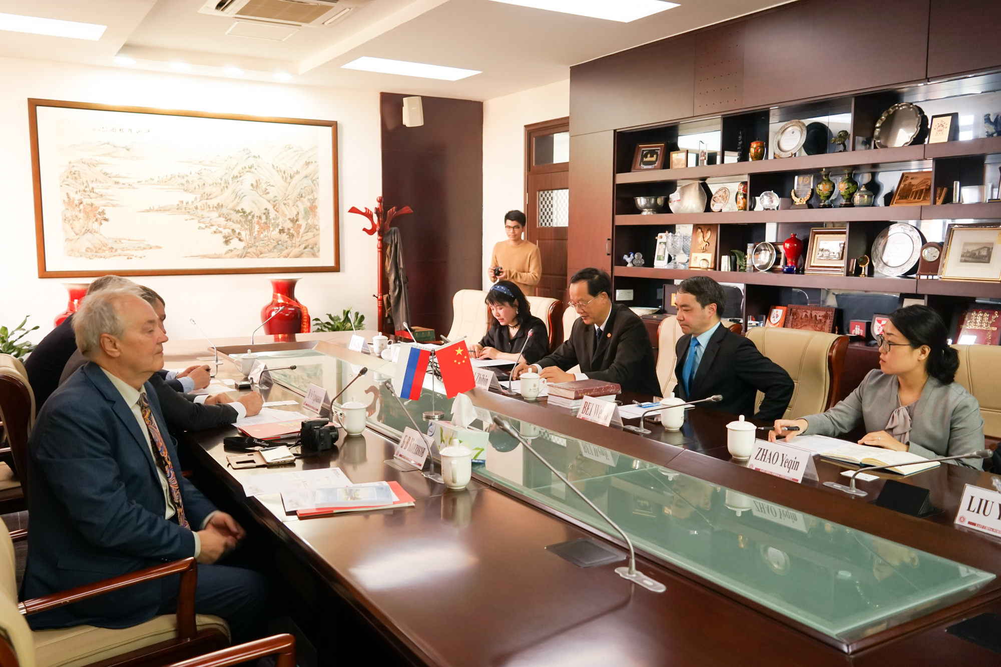 A delegation from the Perm State University, Russia, meets with ECNU vice President Li Zhibin.