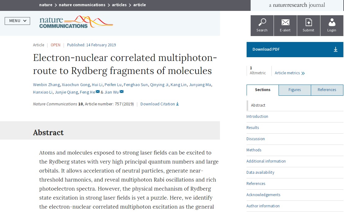 The results are published in the February 2019 issue of Nature Communications under the title Electron-nuclear fractured multiphoton route to Rydberg fragments of molecules. The work on this project was completed in cooperation with He Feng, a researcher from Shanghai Jiao Tong University. East China Normal University is credited as the first author at the institute leveland Zhang Wenbin, a Ph.D candidate from ECNU’s the State Key Laboratory of Precision Spectroscopy, is the first author of this paper.