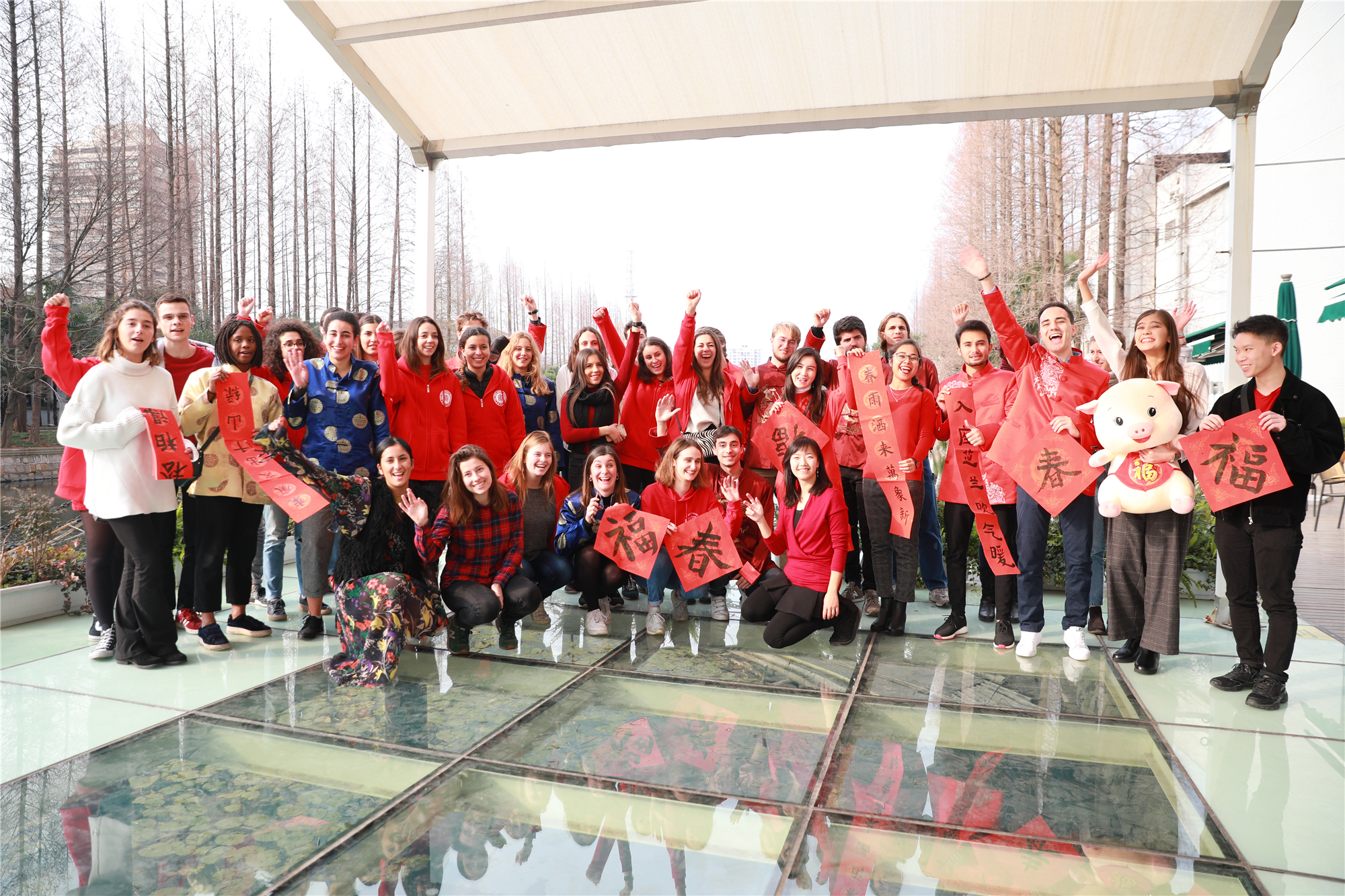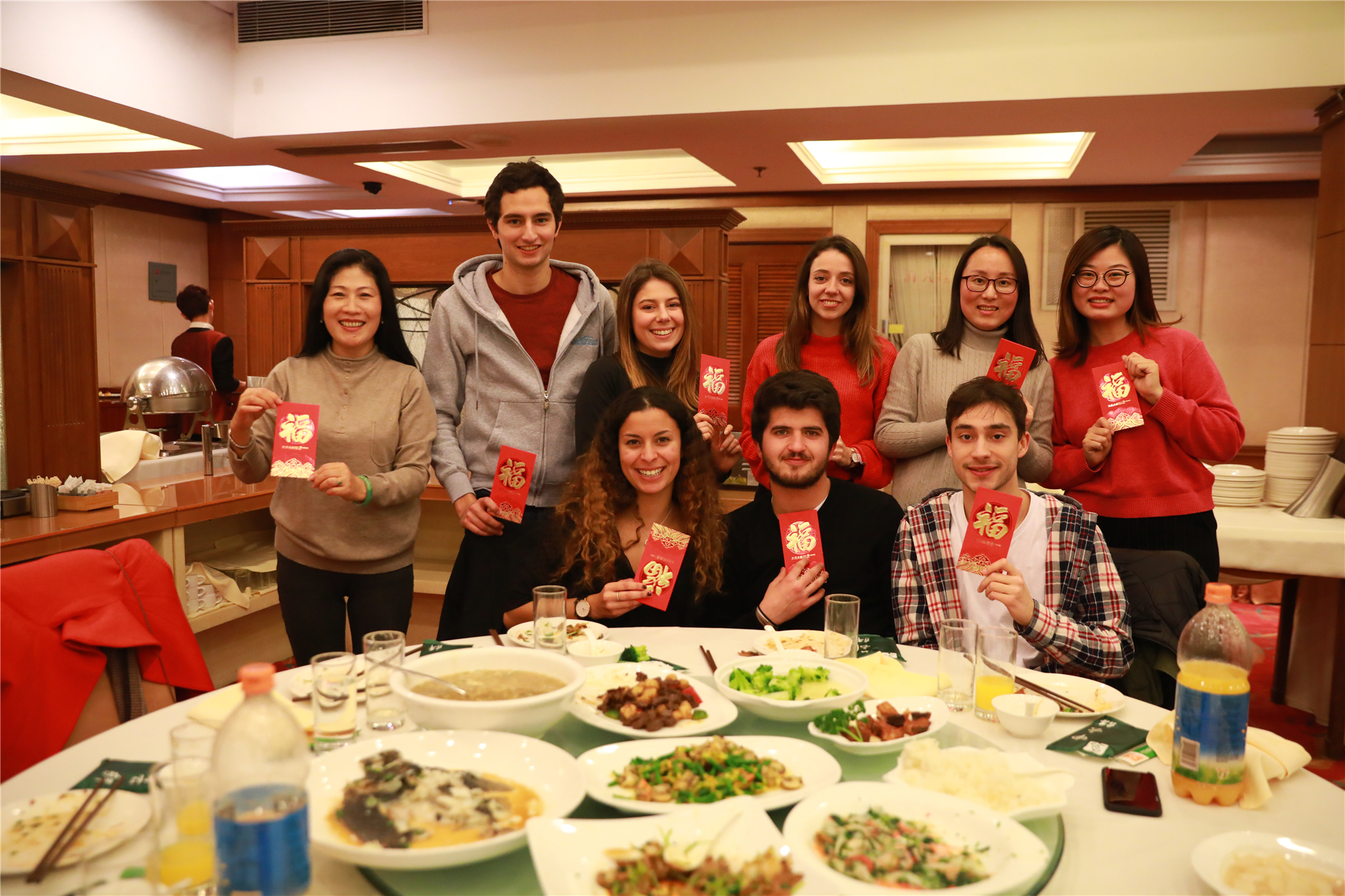 “Happy New Year! Happy New Year! Wish everyone a Happy New Year!” At the dinner, Chinese students and international students stood together and celebrated New Year’s Eve through singing holiday songs, impromptu performances, various games and the unique “Lucky Envelope” prepared by teachers from the Center for International Education. The customary Spring Festival dinner was held for students at both Minhang and Putuo campuses, which was linked through a Wechat group that allowed them to interact online.