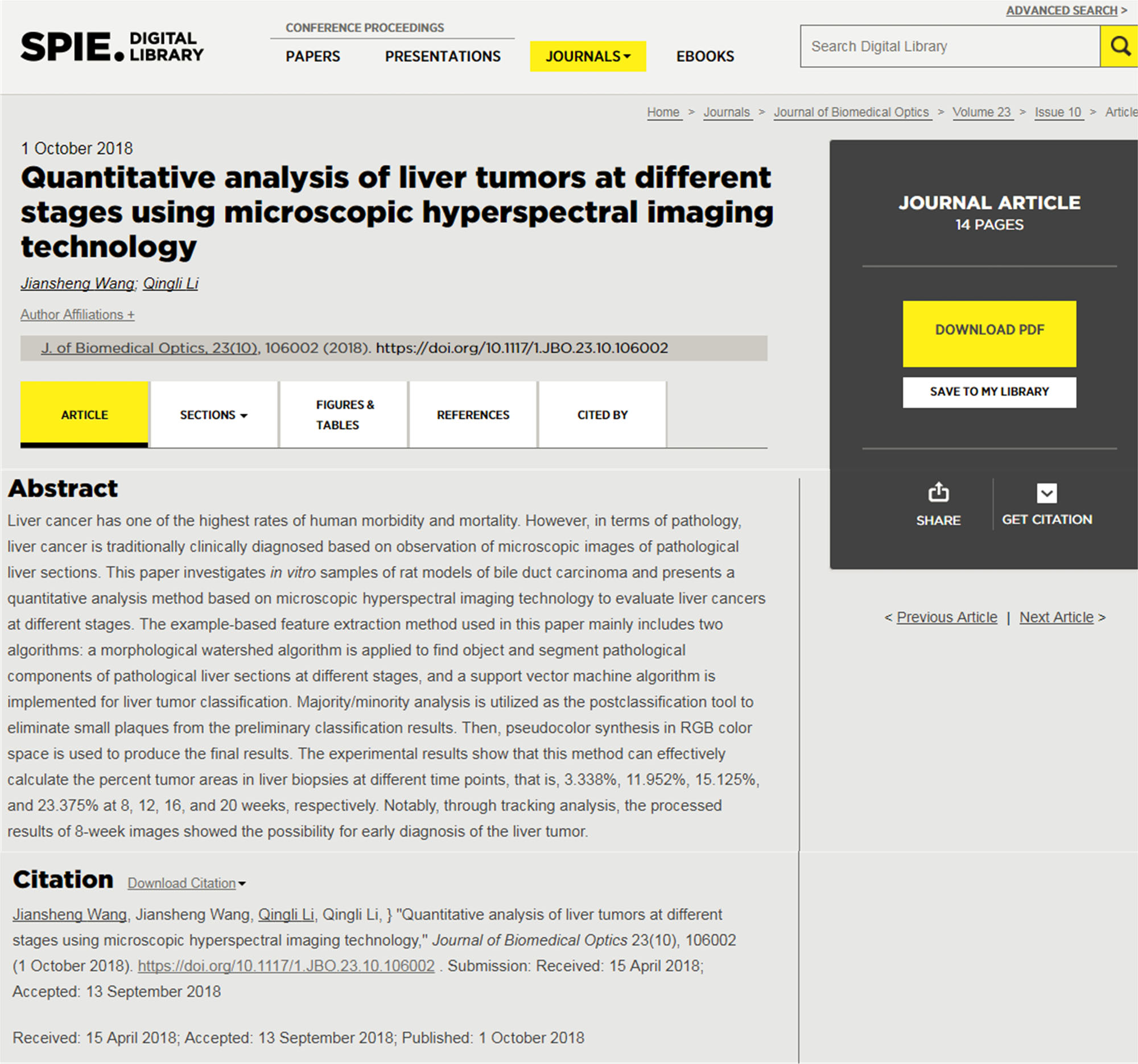 Jiansheng Wang, from the School of Information Science Technologies, published her essay “Quantitative analysis of liver tumors at different stages using microscopic hyperspectral imaging technology”in SPIE Journal. JOURNAL OF BIOMEDICAL OPTICS is a well-known journal of photobiology under the International Society for Optics and Photonics (SPIE). In the standard rankings of Chinese Academy of Sciences its impact factor is 2.367.