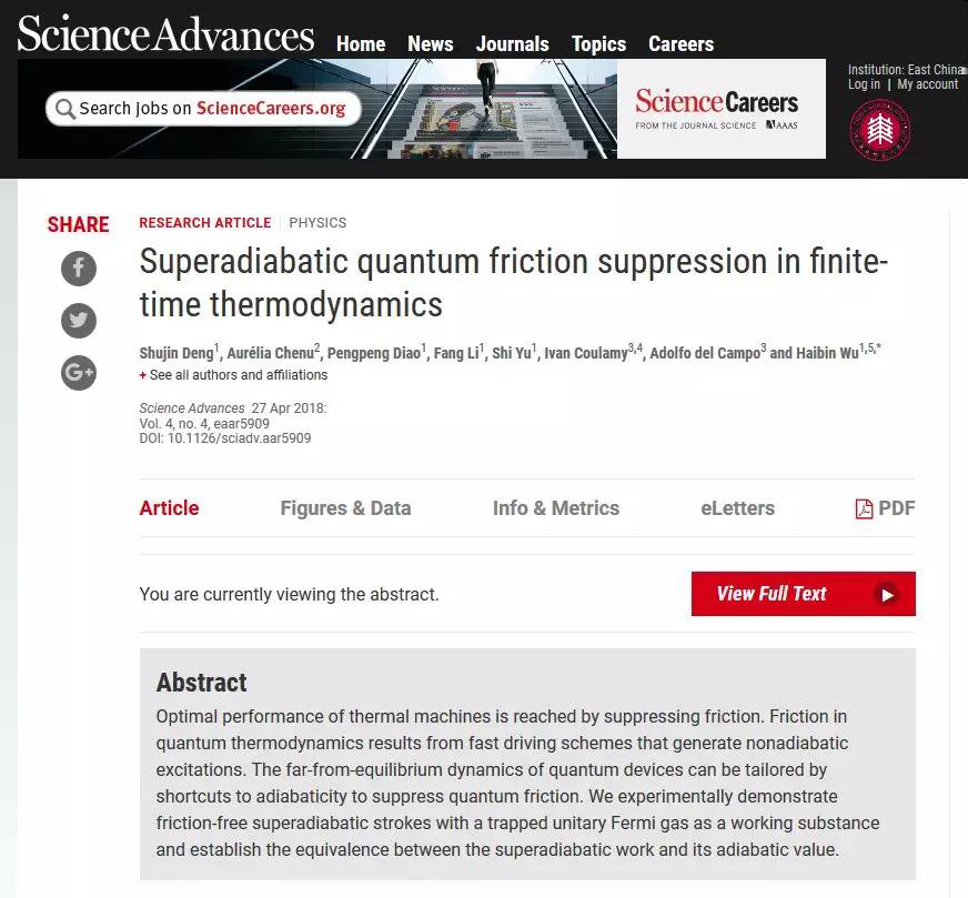 ON 28 April, Deng Shujin, Ph.D candidate at ECNU State Key Laboratory of Precision Spectroscopy, along with corresponding author Prof. Wu Haibin of the ECNU State Key Laboratory of Precision Spectroscopy, published their article “Superadiabatic quantum friction suppression in finite-time thermodynamics” in the renowned international academic journal Science Advances.