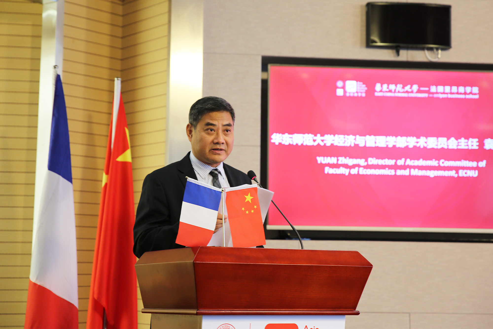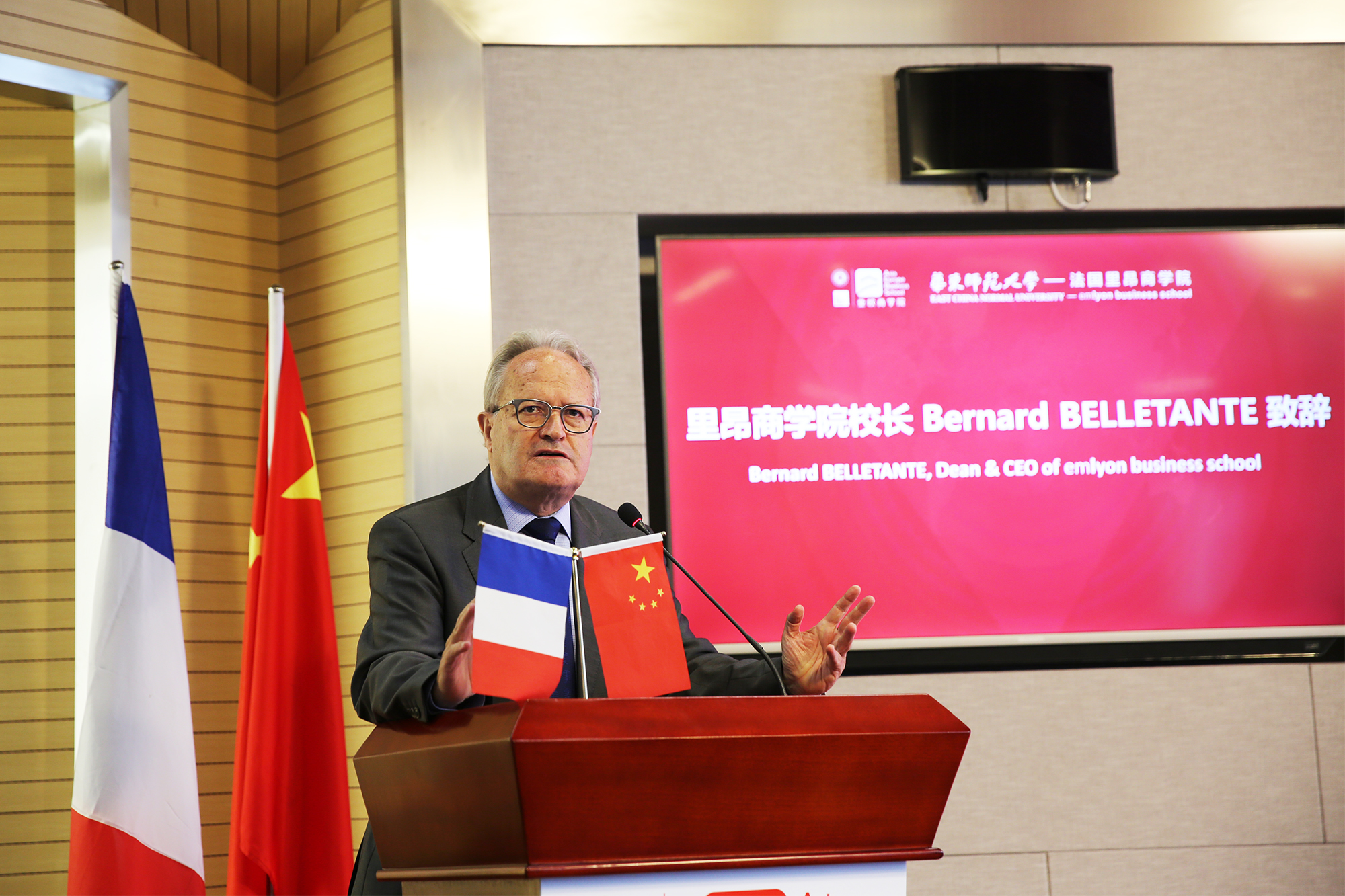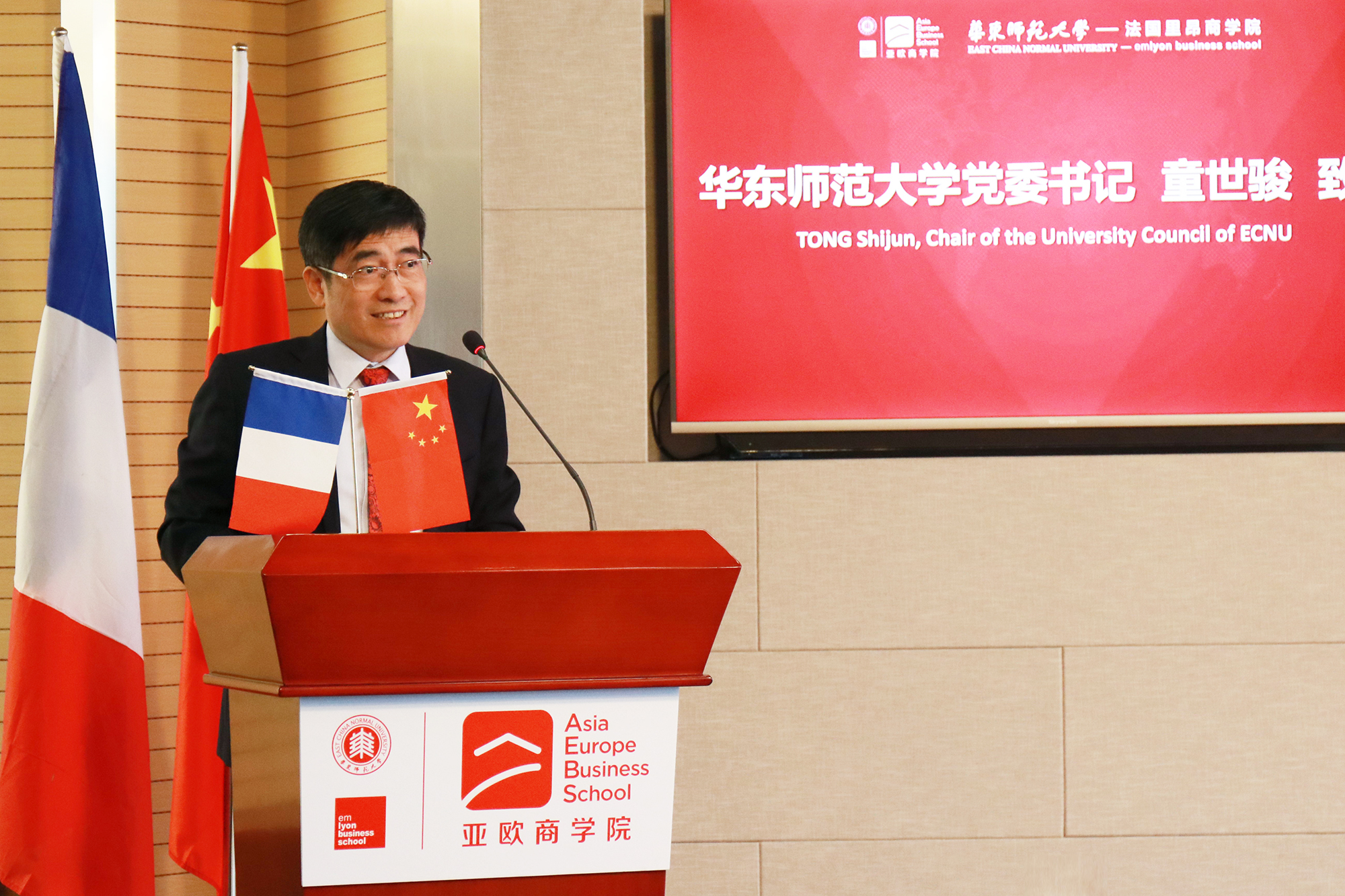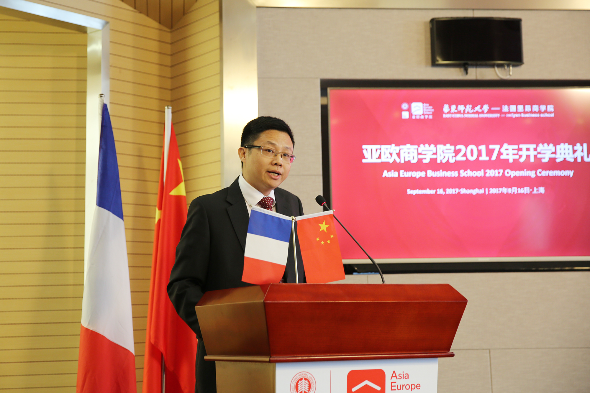 Tong Shijun, the University Council chairman of ECNU; Vice ECNU president Wang Rongming; Bernard Belletante and Tugrul Atamer, president and vice president of the EMLYON Business School; Zhou Yunxuan, chief of the International Exchange Division of ECNU; Yuan Zhigang and Yue Hua, director and Party chief of the Academic Committee of the Faculty of Economics and Management; Tang Jifeng, general manager of Zizhu International Education Park; Chen Qinghua, the park’s vice general manager; and representatives from AEBS and principals of famous Shanghai international senior high schools were in attendance. He Jiaxun, vice director of the Faculty of Economics and Management and Chinese head of AEBS, presided over the ceremony to usher in the 2017 Fall Semester as a fresh start for AEBS students.