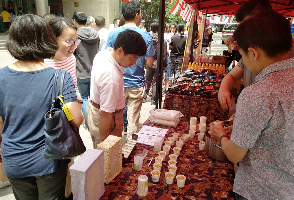 Local ECNU students indulged in some classic Indonesian-style foods in front of ECNU’s Hexi Dining Hall during the celebration and festivities to taste the real, exotic flavor of Indonesian delicacies. Meanwhile, there were also some additional exhibits set-up to display the unique cultural elements of Indonesian handicrafts, musical instruments and clothing.