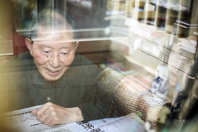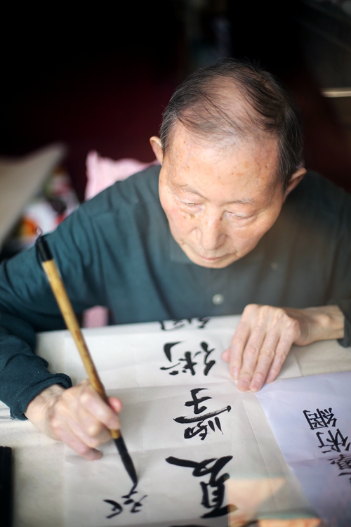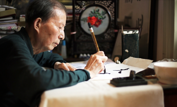 Yuan makes an inscription for Great China Review of ECNU at his home in June 2013.