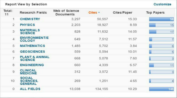 This unique and comprehensive compilation of science performance statistics and science trends data is based on 10 million articles, notes and reviews published in roughly 11,000+ indexed journals that are recorded by Web of Science of Clarivate Analytics. It categorizes these journals into 22 broad disciplines.