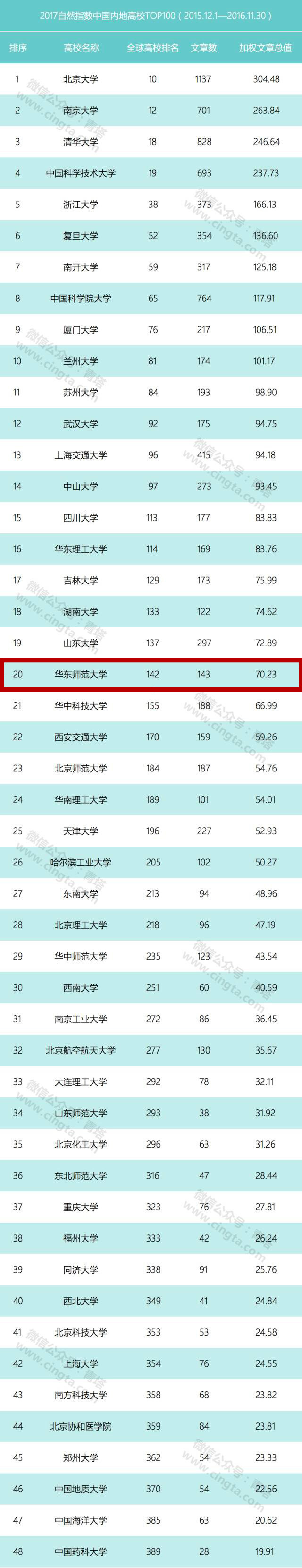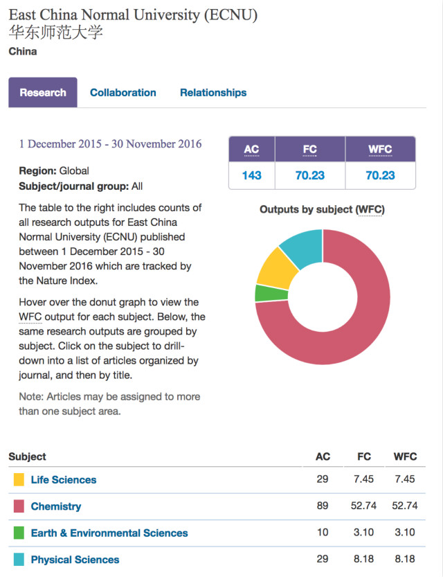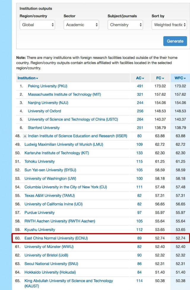 The newly released Nature Index 2017 showed ECNU’s chemistry moved up a few spots to be placed 69th among global research institutions, 60th among universities around the world, and 18th among Chinese universities, after it broke into a global top 100 for the first time in the previous year.