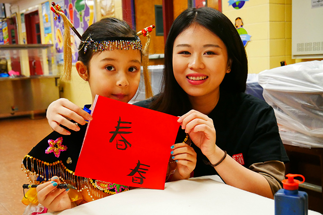 They set up a China booth to showcase traditional folk customs for celebration of the most important festival for Chinese people, including sticking the Chinese character “fu”, which means good fortune, pasting up Spring Festival scrolls, do the paper-cutting of the Chinese character “chun” (spring), writing Chinese calligraphy of “chun”, and handing out lucky money red envelops, which enchanted crowds of onlookers.