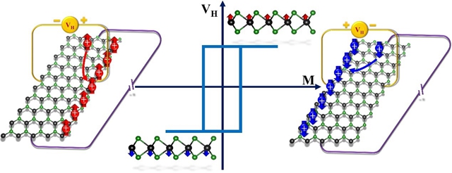 Combining first-principles calculations with group theory and optical analysis programs they own developed, they predict that an unusual chirality-dependent optical band gap exists in such ferrovalley materials, indicating the possibility to judge the occurrence of valley polarization and its polarity using noncontact and nondestructive circularly polarized optical means. More interestingly, they introduce a new form of Hall effect, namely anomalous valley Hall effect in ferrovalley materials. Except for the combination of spin and valley Hall current in normal one, an additional charge Hall current deriving from the spontaneous valley polarization is present in the anomalous valley Hall effect. The long-lived charge, spin and valley accumulations on sample sides brings charming phenomena, such as emission of photons with opposite circular polarizations on the two boundaries, and more importantly provides a really feasible route toward data storage utilizing ferrovalley materials. As shown below, based on the anomalous valley Hall effect, the binary information is stored by the valley polarization of the ferrovalley material, which could be controlled by the magnetic moment through an external magnetic field. And it can be easily “read out” utilizing the sign of the transverse Hall voltage. Besides the nonvolatile electrically reading and magnetically writing memory devices, valley filter, valley valve and other promising valleytronic devices are anticipated.