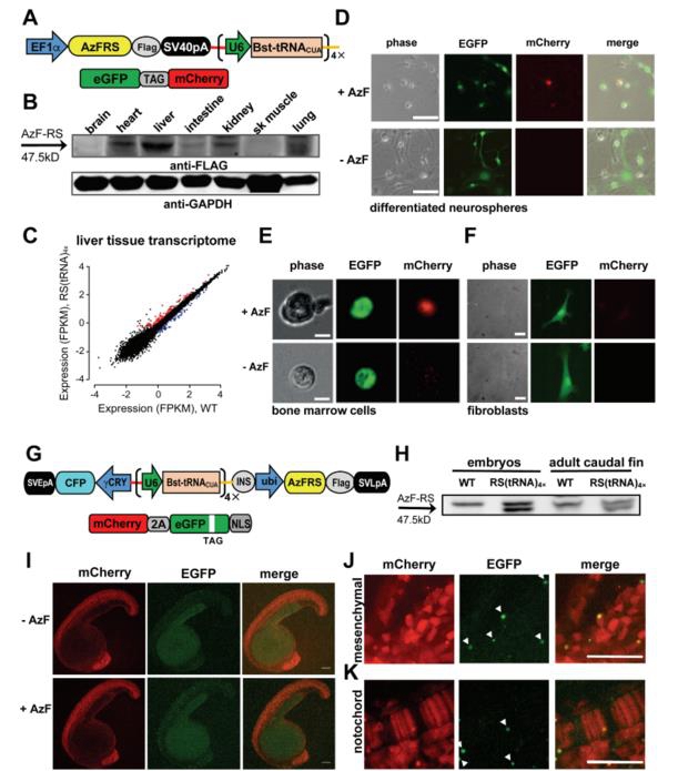 The genetic code can be expanded to encode unnatural amino acids (Uaas) by introducing an orthogonal tRNA/aminoacyl-tRNA synthetase (aaRS) pair to decode a stop codon. Initially developed in Escherichia coli1, this strategy has been proven generally applicable in eukaryotic cells2 and in generating transgenic invertebrates capable of Uaa incorporation, including Caenorhabditis elegans3 and Drosophila melanogaster4. Although cells and tissues of mouse can be transduced transiently to incorporate Uaas5, it remains unknown whether transgenic vertebrates with a heritable expanded genetic code system-wide can be generated, as it is unclear whether the biological complexity of vertebrates allows the introduction, maintenance and transmission of the newly introduced genetic material for code expansion. In this paper, ECNU scientists and their collaborators for the first time report the generation of transgenic mice and zebrafish with an expanded genetic code, providing valuable vertebrate model animals for biological and biomedical research.