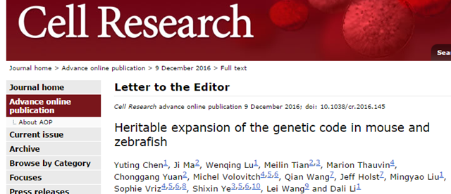 On December 9. Cell Research published “Heritable expansion of the genetic code in mouse and zebrafish” on line. The paper is a joint researcch result of East China Normal University, Ecole Normale Supérieure, Université Paris VI, Collège de France, Sydney Medical School of University of Sydney and University of California at San Francisco. It for the first time reports the heritable expansion of the genetic code in vertebrates.
