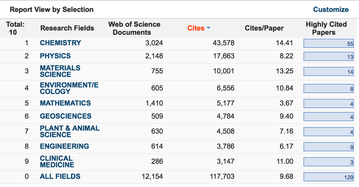 Geosciences was named for the first time. In the discipline, 509 articles were carried by publications with 4,784 citations, or 9.4 citations per article. Of them, four were highly cited papers.