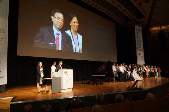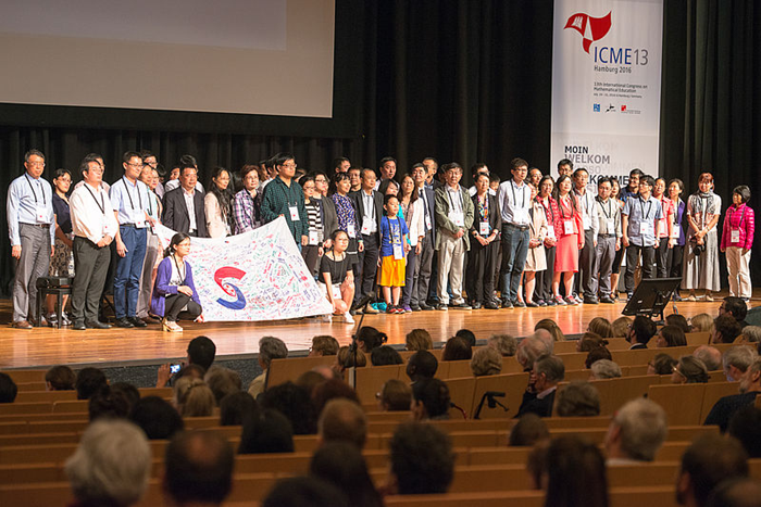 Chinese delegates at ICME-13 gather at the handover ceremony in Hamburg.