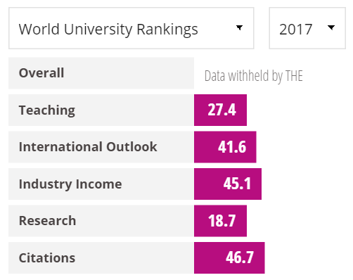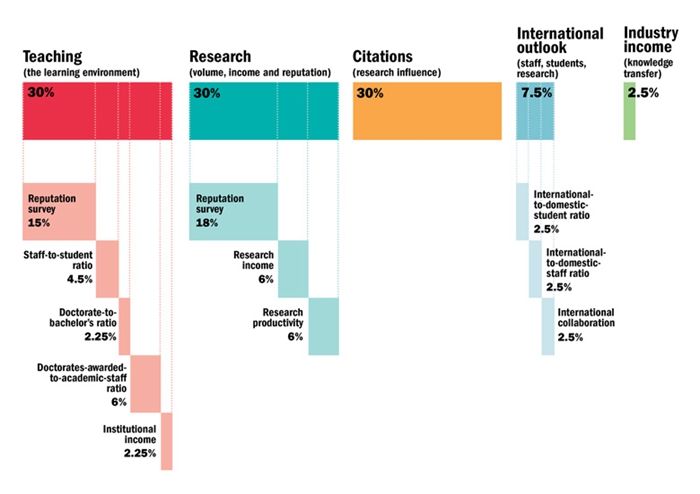The inaugural 2010-2011 methodology contained 13 separate indicators grouped under five categories: teaching (30 percent of final score), research (30 percent), citations (30 percent), international outlook (7.5 percent), industry income (2.5 percent). THE’s data are trusted by governments and universities and are a vital resource for students, helping them choose where to study.