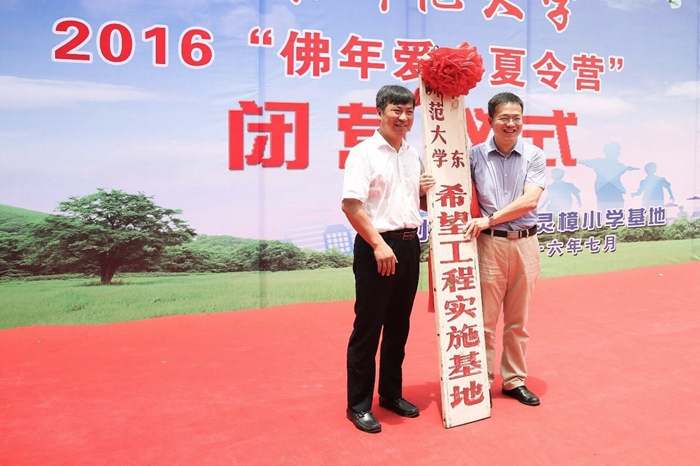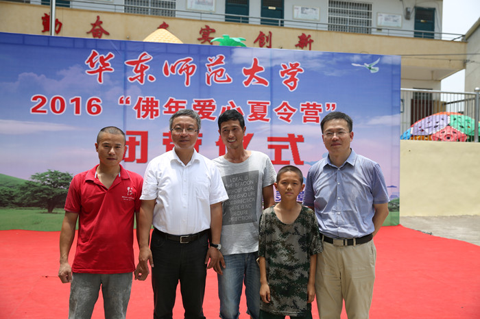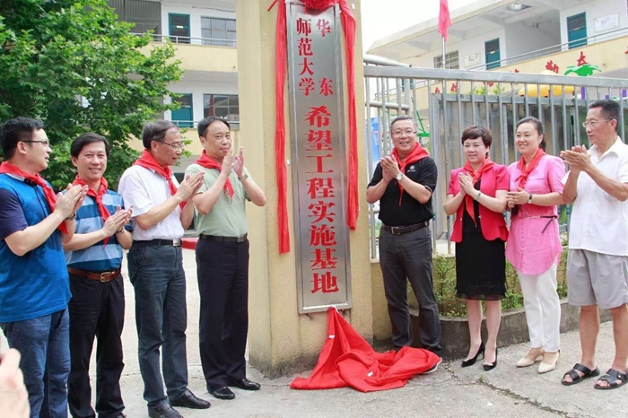 ECNU and local government officials, including Ren Youqun, vice president of ECNU who now serves as a vice mayor of Shangrao temporarily; ECNU Vice President Dai Liyi; tenured professor Zhuang Huiming; Li Zhicong, top leader of the No. 2 High School Attached to ECNU; Zhou Fuhua, director of Xinzhou District’s publicity department; Zhong Ming, chief of Xinzhou District Education and Sports Bureau; Zeng Hua and Xu Ming, leaders of Lingxi Township, attended the opening ceremony of the summer camp in the Lingzhang Primary School on July 12 and unveiled a new plaque to open the ECNU Project Hope Base.
