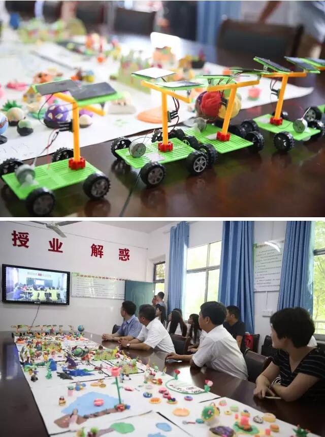 A handicraft exhibition was held to showcase achievements of the summer camp, displaying photos, clay painting, leaf bookmarker, handmade tea eggs and solar-powered hybrid auto models.