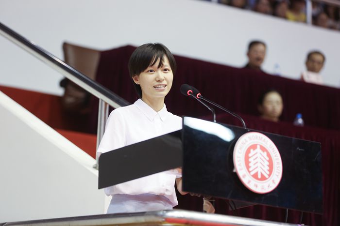 A representative of teachers, Yang Haibo, a Ph. D. tutor of the Chemistry and Molecular Engineering School of ECNU, who is a Yangtze River Scholar Distinguished Professor and winner of the China National Funds for Distinguished Young Scientists, and Guo Xiuyan, a tutor of doctorate students, spoke at the ceremony.