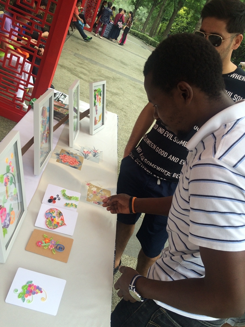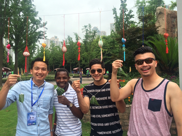 On June 10, with the invitation of Sports Bureau of Putuo District, some ECNU overseas students came to Mengqing Park to join a Dragon Boat Festival party with the local people. During the party, they made Zongzi with the direction of local older ladies, drank rice wine, and found many delicate folk arts and crafts related with the festival.