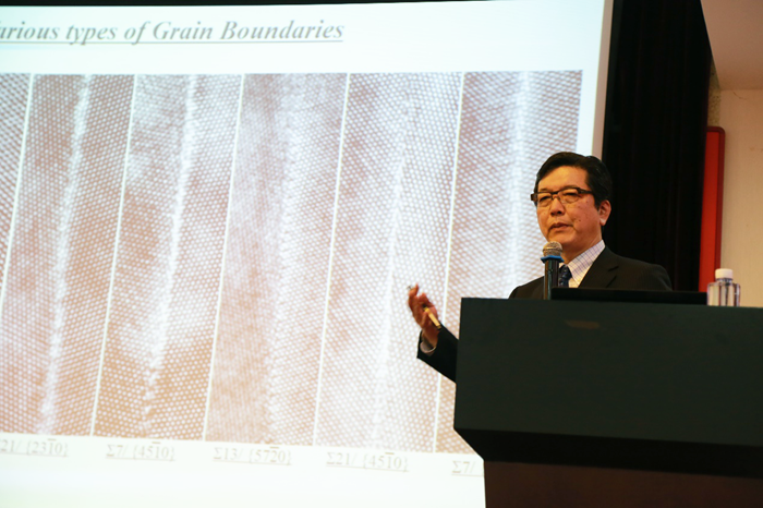 After the ceremony, Ikuhara delivered a speech titled Grain Boundary Segregation, Vacancies and Properties in Oxides, explaining the application of spherical aberration-corrected Scanning Transmission Electron Microscope (STEM) in the research of oxide material grain boundary segregation, defect and performance. He also introduced the ABF (Annular Bright Field) and Differential Photocalorimetry (DPC), pointing out that the technologies can play a key role in the research of polarization information function oxide material interface structure, local electrical fields and magnetic fields.
