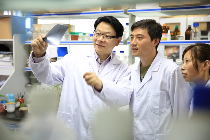 Professor Li Xiao Tao (Left) works at the laboratory with his team members.