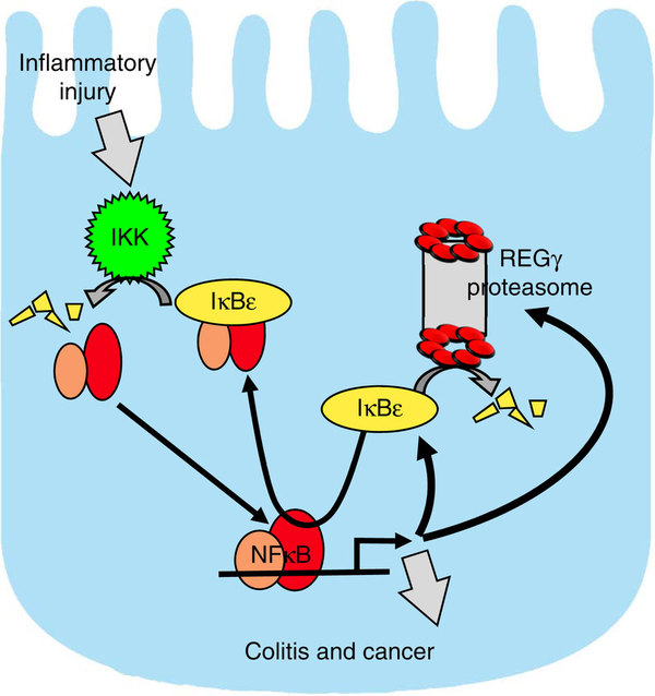 In this paper, Professor Li and his partners demonstrate that mice deficient for REGγ, a proteasome activator, show significantly attenuated intestinal inflammation and colitis-associated cancer in dextran sodium sulfate model. Bone marrow transplantation experiments suggest that REGγ’s function in non-haematopoietic cells primarily contributes to the phenotype. Elevated expression of REGγ exacerbates local inflammation and promotes a reciprocal regulatory loop with NFκB involving ubiquitin-independent degradation of IκBε. Additional deletion of IκBε restored colitis phenotypes and inflammatory gene expression in REGγ-deficient mice. Their study identifies REGγ-mediated control of IκBε as a molecular mechanism that contributes to NFκB activation and promotes bowel inflammation and associated tumour formation in response to chronic injury.