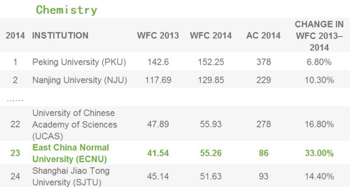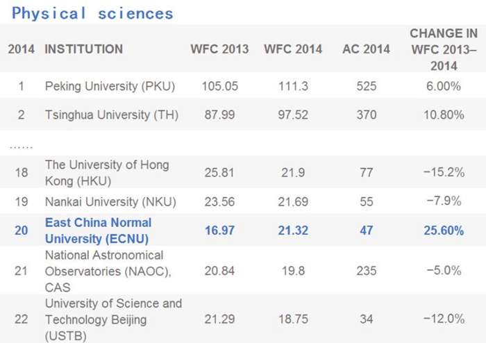 Nature Index 2015 China also published listings of top 50 Chinese research organizations in physical, chemical and biological fields. The lists showed that ECNU stood No. 20 in physical science, No. 23 in chemical science, and No. 30 in biological science.