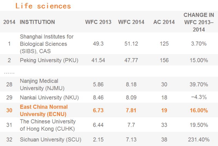 According to Nature Index China, ECNU stands No. 20 in physical science, and No. 30 in life sciences.