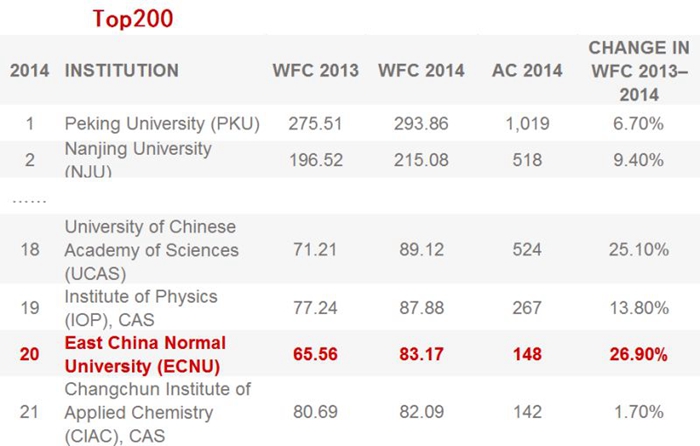 ECNU was No. 17 of the top 200 Chinese research organizations, according to a listing published by Nature Index 2015 China on December 17, 2015.