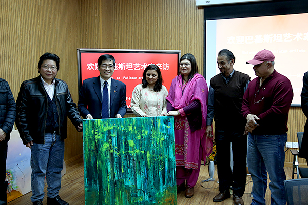The two parties then exchanged their paintings. At the painting-exchange ceremony, ECNU University Council Chairman Tong Shijun made a welcome speech on behalf of the university. He said that at the beginning of last year, Chinese President Xi Jinping and Pakistani President Mamnoon Hussain named the year 2015 “the year of Sino-Pakistani friendship.” Both “Silk Road” in history and today’s “21st Century Maritime Silk Belt” witnessed the friendship between the two countries. Tong hoped that taking the opportunities of “One Belt, One Road,” the Pakistani artists and ECNU could form a cooperation mechanism, increase art, and humanity exchanges, so as to enhance and pass down the sincere friendship between the two peoples.