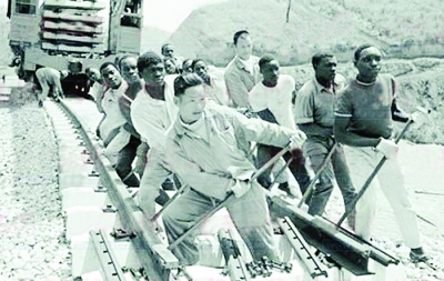 Chinese and Tanzania crew work on the Tanzam Railway.