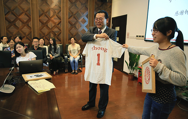 ECNU's winners of Mingde Scholarship presents some gifts made by themselves to Dr. Chung.