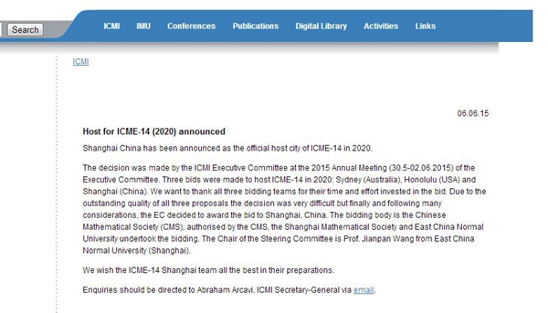 According to the International Commission on Mathematical Instruction (ICMI) of the International Mathematical Union (IMU), Shanghai will host ICME-14 in 2020.
