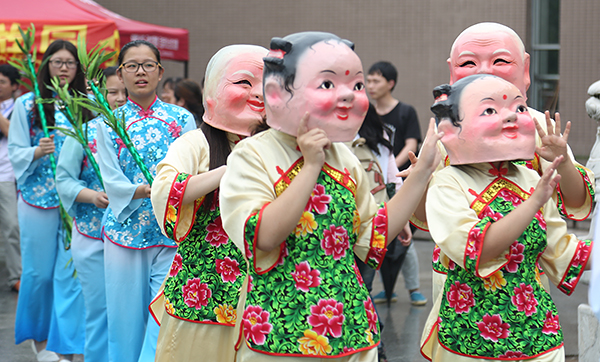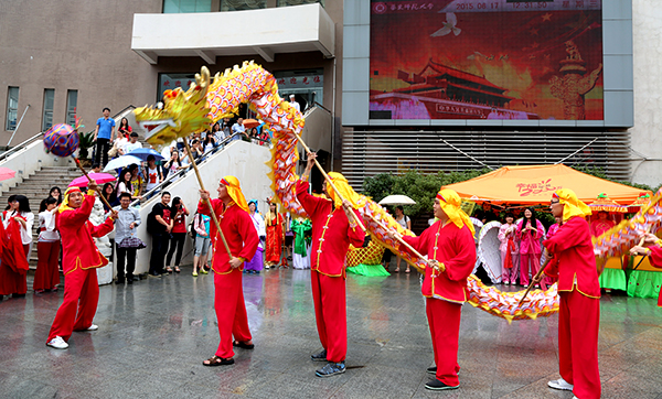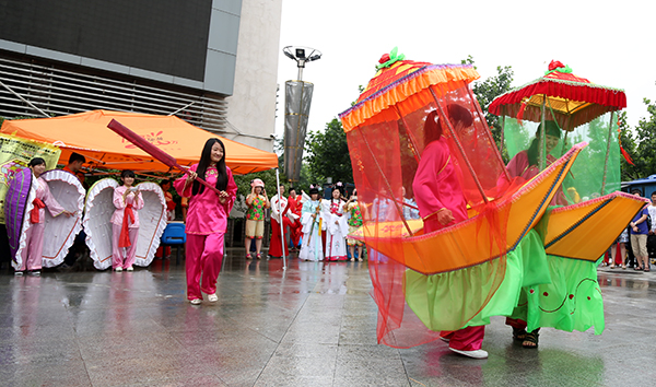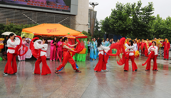 The folk customs team perform traditional dances at the square before Huamin Canteen.