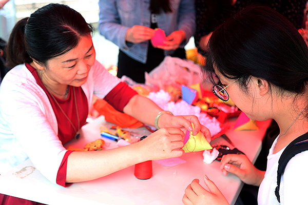 At the square, the Dragon Dance, Boat Dance, and Yangge Dance were performed by the folk customs team, which provided a great opportunity for students and teachers to appreciate the charm of these traditional dances. The vivid reenactment of a story from Legend of White Snake presented the audience with more background knowledge about the festival. Some folk artists even taught participants how to make sachets on-site. During the Dragon Boat Festival, children usually wear sachets filled with cinnabar, realgar, and aromatics. It is believed that doing so helps to drive away evil spirits and prevent illness. At the same time, many think that kids wearing sachets are simply more adorable.Inside the sachets are cinnabar, realgar and aromatic odor. The shape of the sachet varies, and numerous sachets are strung together on display. In some cities in southern China, young people will also use sachets to express their affection for one other.