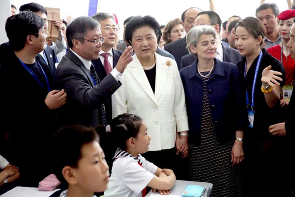 Ren Youqun introduces the Synchronous Classroom System to Liu Yandong and Irina Bokova.