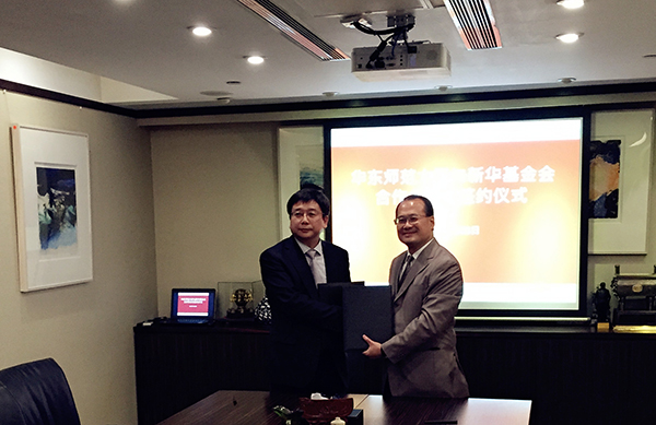 On behalf of ECNU, Chen signs an agreement with the Sun Wah Group in Hong Kong.